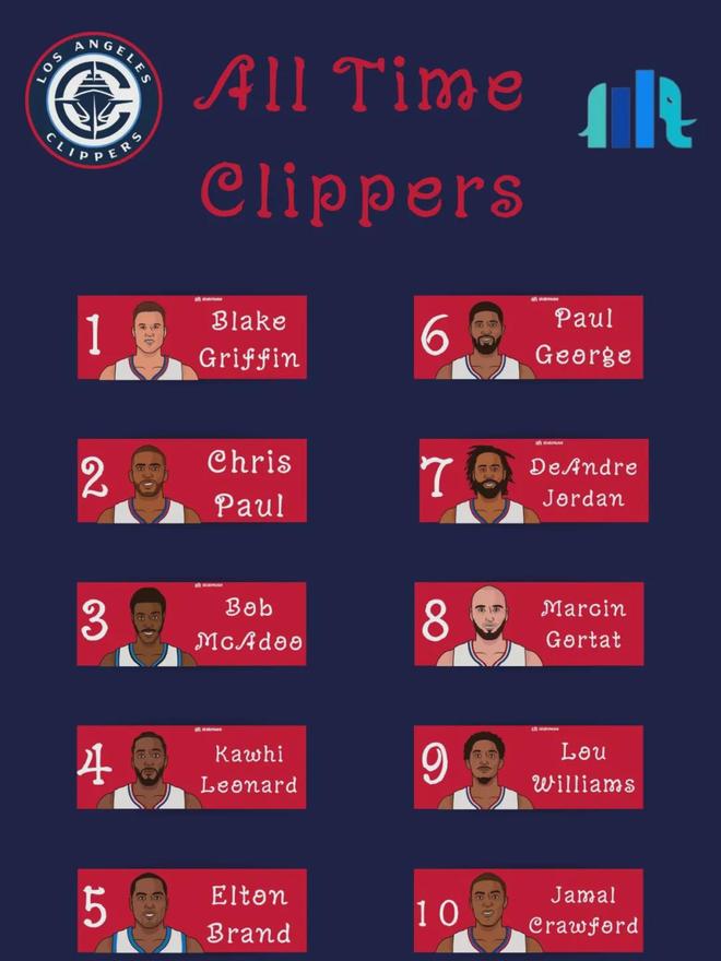 今年夏天,快船自媒體LA Clippers Muse和球迷評選快船隊史十大球星:1、格里芬;2、保羅;3、鮑勃-麥卡杜;4、倫納德;5、埃爾頓-布蘭德;6、保羅-喬治;7、小喬丹;8、馬爾欽-戈塔特;9、路易斯-威廉姆斯;10、賈馬爾-克勞福德。